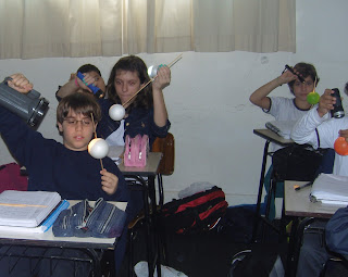 A professora Renata Boscoli usou uma bola (representando a terra), um farolete (representando o sol) e um palito (representando o eixo da terra) para ensinar sobre as consequências da rotação (dia e noite), da translação (as 4 estações) e das fases da lua.